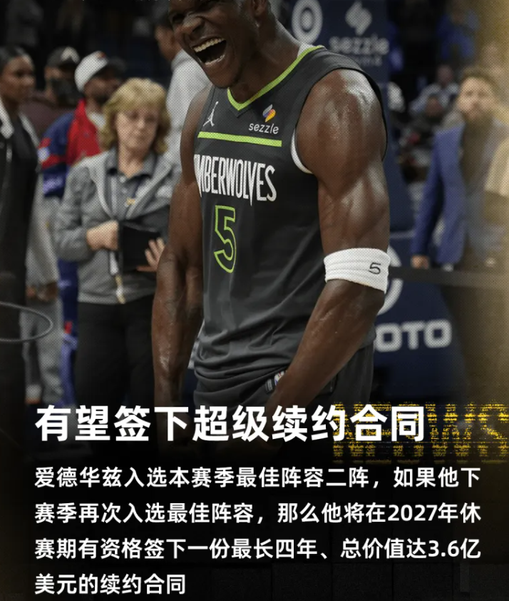 若爱德华兹在下赛季再度荣膺最佳阵容,他将具备签订一份价值4.6亿美元、为期四年的合同的资格。