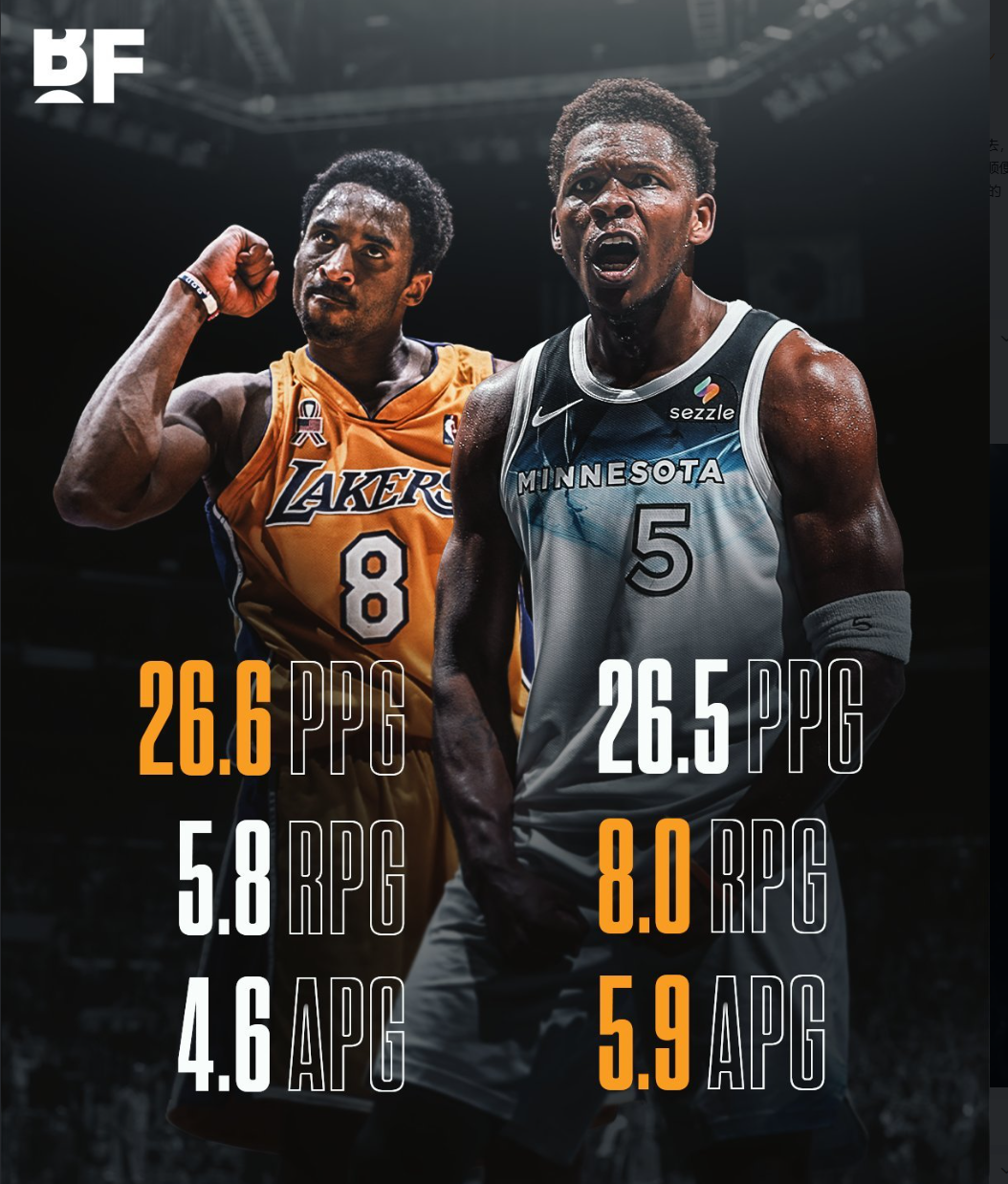美媒在今天将23岁的科比和华子季后赛数据做出对比,科比得分略高、华子助攻篮板领先。